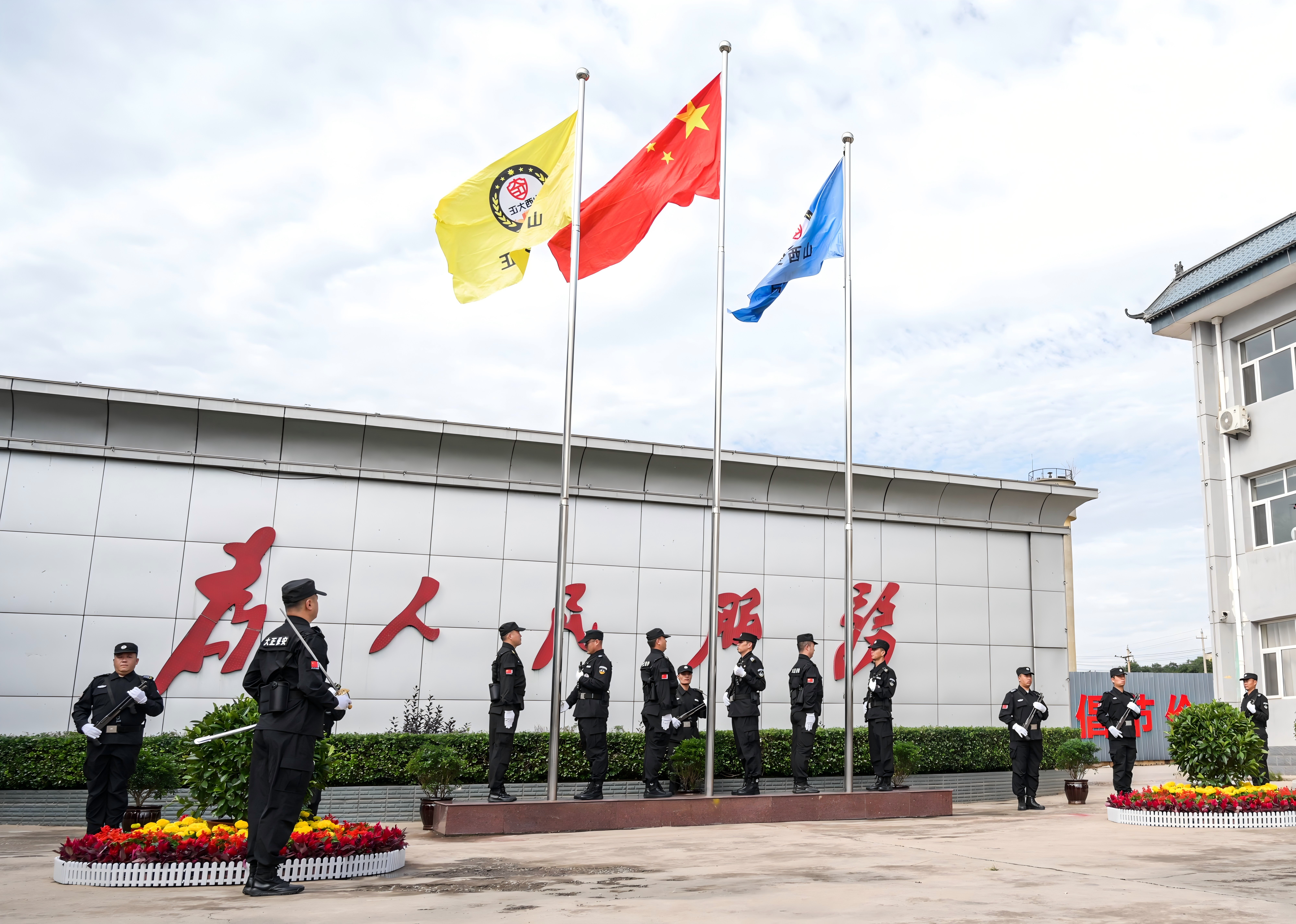 節(jié)日的公司院內(nèi)外,四周花團錦簇,大門口燈籠高掛、彩旗飄揚,為節(jié)日增添了濃厚的喜慶氛圍。公司運鈔車、巡邏車、運兵車干凈整潔,排列在場地兩側(cè),升旗儀式更顯隆重。9時30分,集團公司、各子公司領(lǐng)導(dǎo)和機關(guān)各部門、城區(qū)員工共300多人整齊列隊,懷著激動的心情,手持小國旗,臉上貼著愛國貼紙、洋溢幸福的笑容,眼神中充滿了對祖國的熱愛和對升旗儀式的期待。