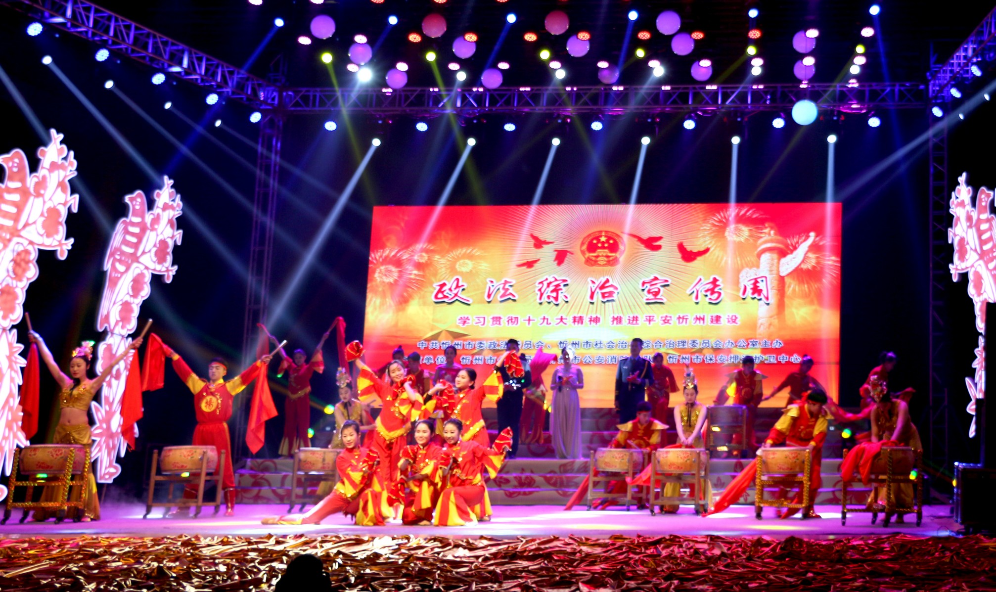 晚會以“學習貫徹十九大精神,推進平安忻州建設”為主題,歌頌了忻州市在平安建設中取得的卓越成績和政法綜治戰(zhàn)線干部的無私奉獻精神。晚會節(jié)目精彩紛呈,“牽手平安”藝術團表演的《鼓舞中華》、男女對唱《幸福贊歌》、小合唱《強軍戰(zhàn)歌》、歌伴舞《建設和諧大家園》等節(jié)目獲得了觀眾陣陣掌聲。